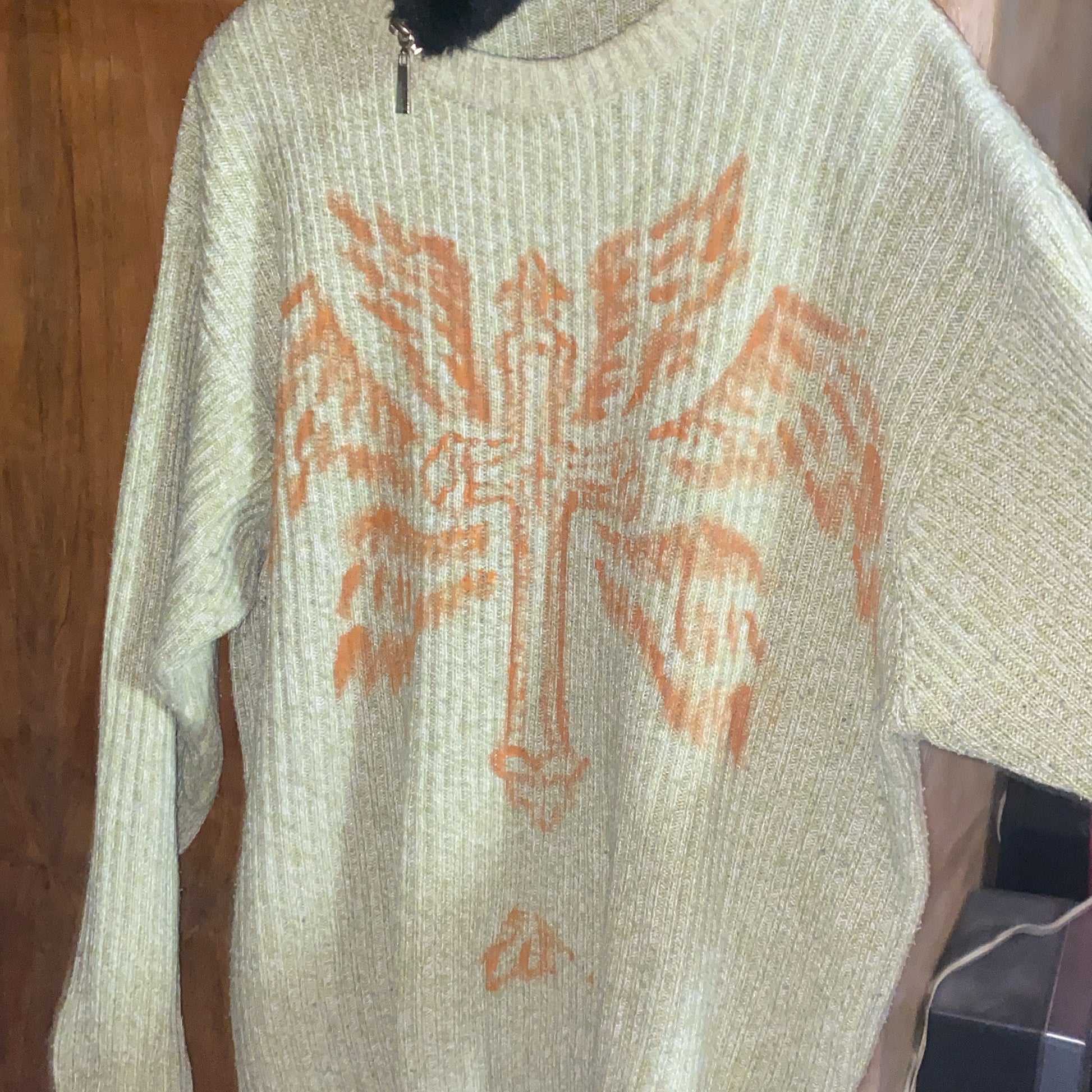 Maglione Grunge Verde Pastello con Croce e Sei Ali